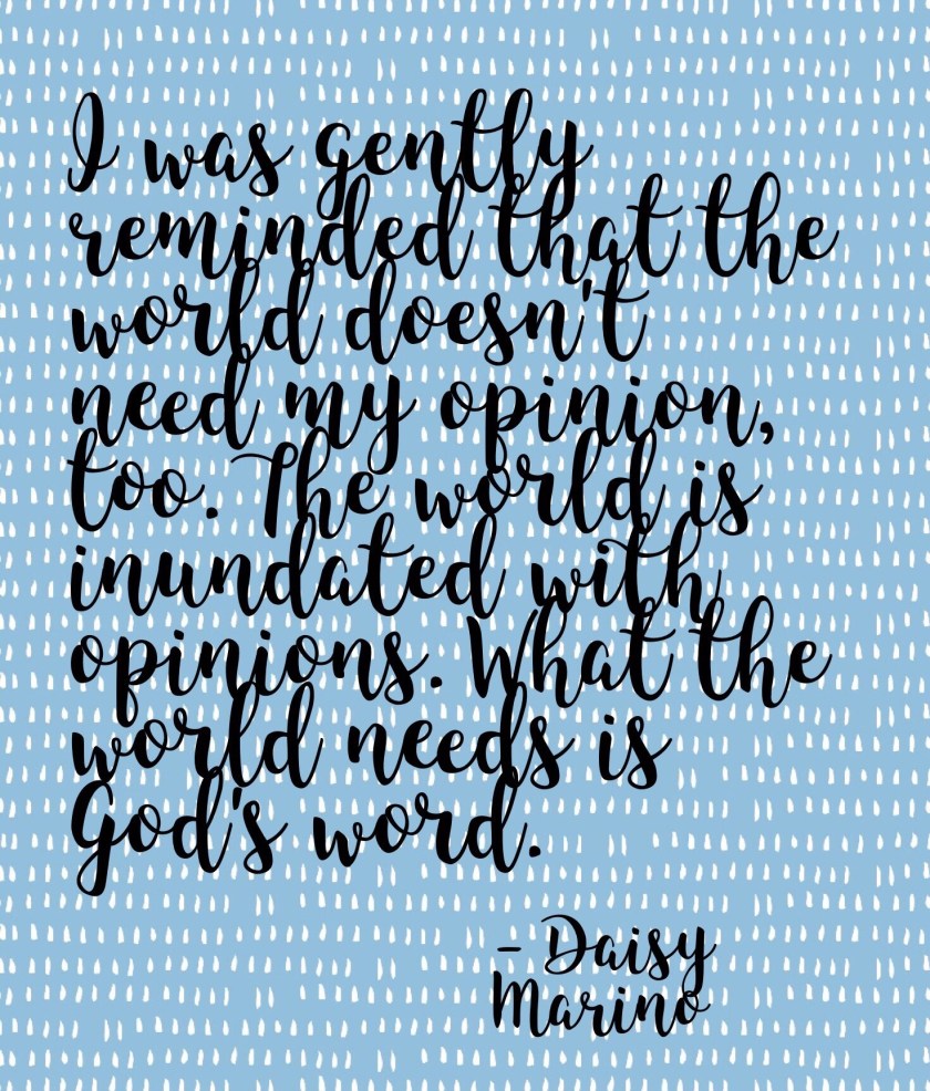 But – this morning when I was sitting in church I was gently reminded that the world doesn’t need my opinion, too. The world is inundated with opinions. What the world needs is God’s word, and that’s what I will continue to base all my writing on.