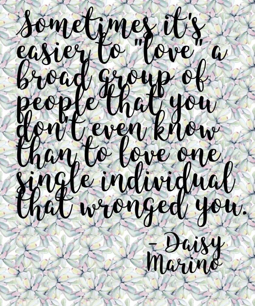 I had a whole paragraph written here about loving others. I was going to tell you that nationality, gender, and religion didn’t matter. I was going to share some ways to exhibit love to others- but then God put me in check. Sometimes it’s easier to “love” a broad group of people that you don’t even know than to love one single individual that wronged you.