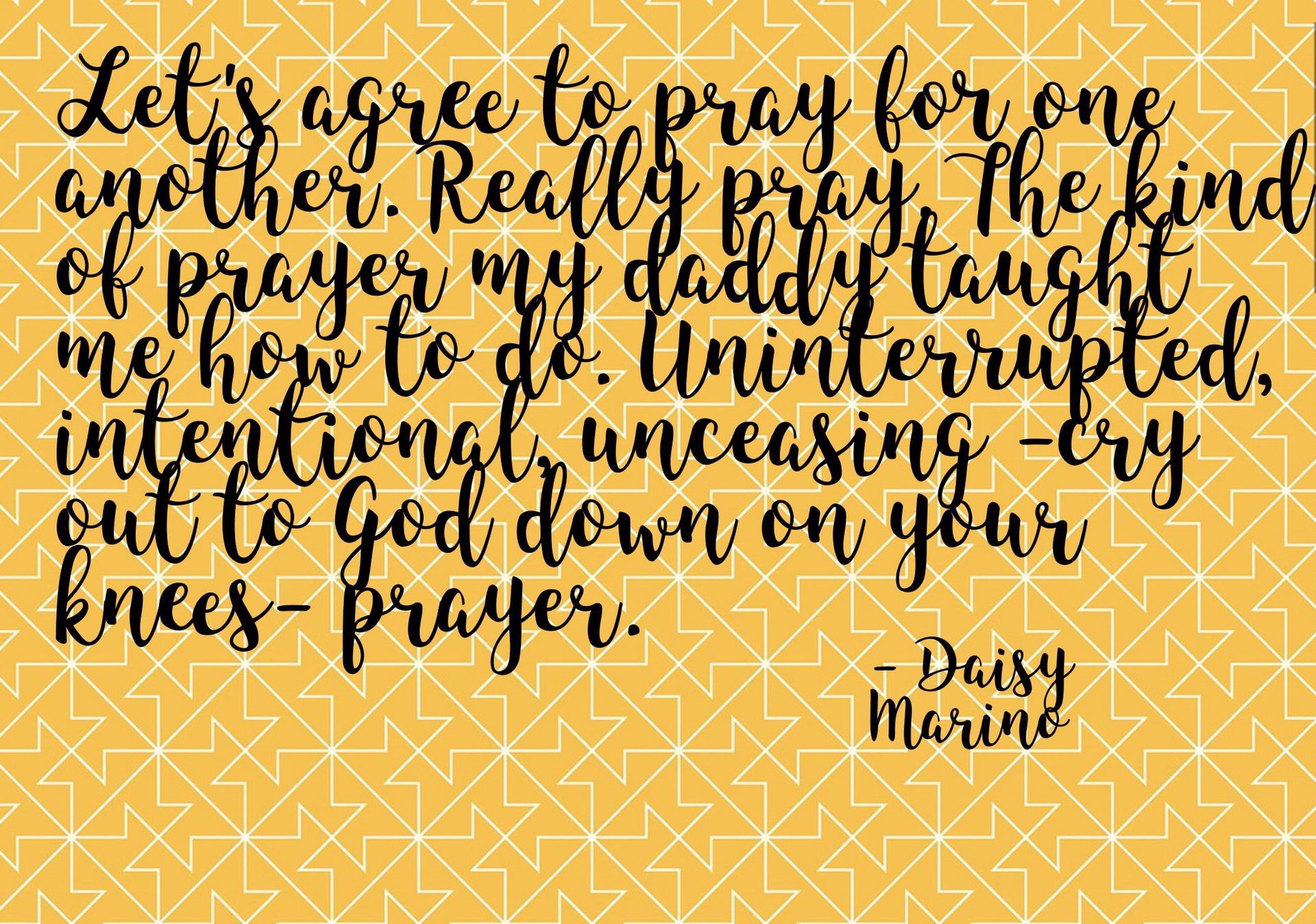 Let’s just pray. Let’s agree to pray for one another. Really pray. The kind of prayer my daddy taught me how to do. Uninterrupted, intentional, unceasing -cry out to God down on your knees- prayer.