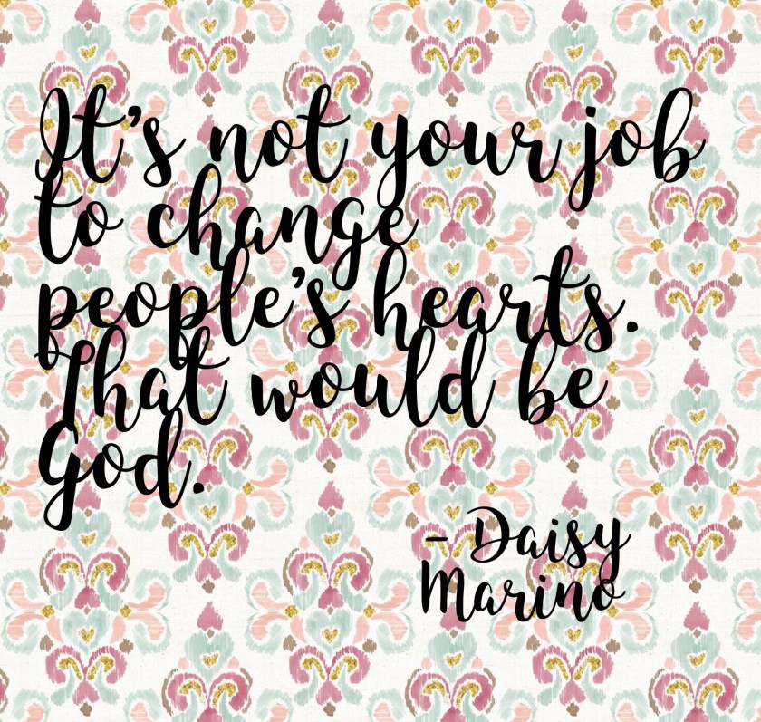 It’s not our job to change people’s hearts. That would be God. It’s our job to live in such a way that people will wonder what we have that they don’t. Then a door will be opened to share the love and hope that has transformed every fiber within us. Be humble. Be kind. Put earthly differences to the side and just love others. Just love.