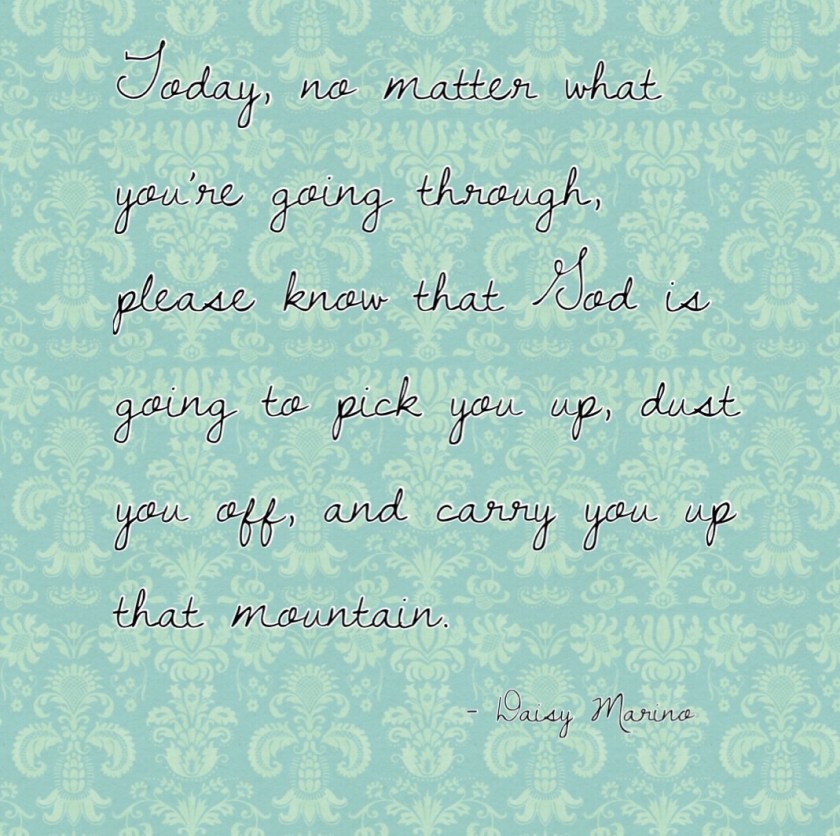 Today, no matter what you’re going through, please know that God is going to pick you up, dust you off, and carry you up that mountain. Just start looking for Him. Search for Him. Wait for Him. Start in His word. He is there, and He is coming for you.