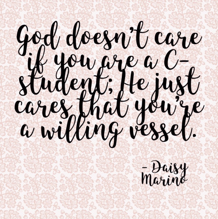 I’ve said all that to say this, God doesn’t care if you are a C- student; He just cares that you’re a willing vessel.
