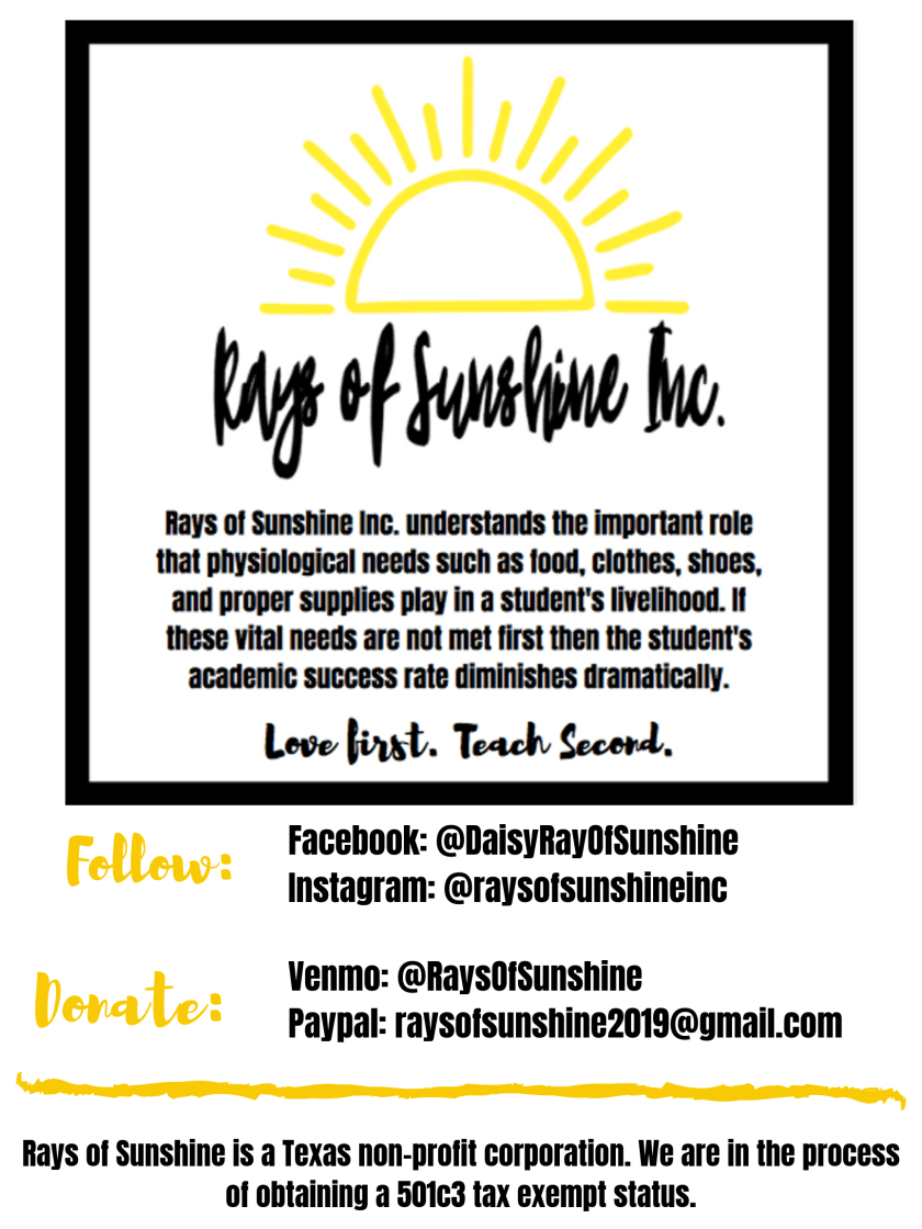 Rays of Sunshine Inc has officially launched! We are so excited to help meet the physiological needs of students in hopes of increasing their academic success.