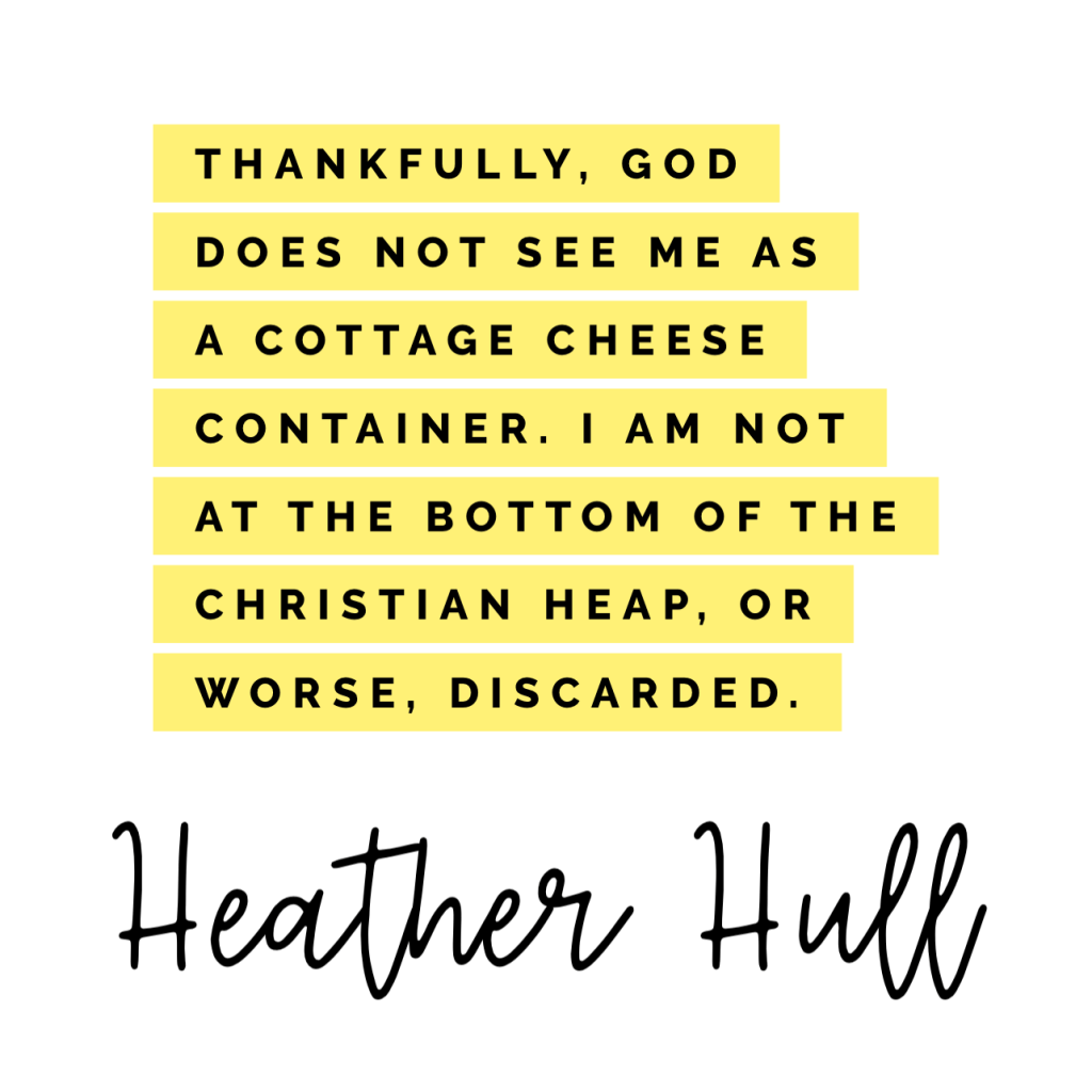 Thankfully, God does not see me as a cottage cheese container. I am not at the bottom of the Christian heap, or worse, discarded. God sees me through the eyes of Jesus who died to give me a new life. He sees me fully reconciled to Him. He wants me. And if my lid is sometimes a little crooked, He is reshaping it and helping make it straight. He seals me in His righteousness. He teaches me to trust in the process, knowing that sanctification is ongoing for a lifetime. He says to me, you are mine and you are worthy. He knows I am not perfect, but he loves me anyway. And though I know He wants me to have a clean heart, he doesn’t throw me away when I give in to sin. He washes me, removes the stains, and holds me close. You see, the cottage cheese dish is just as valuable to God as the Tupperware. So if you have trouble sleeping because of worry, or you complained about your week instead of showing your gratitude, or you yelled at your kids this morning, it is really okay. Ask for forgiveness, and try again. And when your husband asks you if you are going to keep another cottage cheese container, you can just look at him and smile as you put another valuable vessel in your overflowing plastic cabinet.