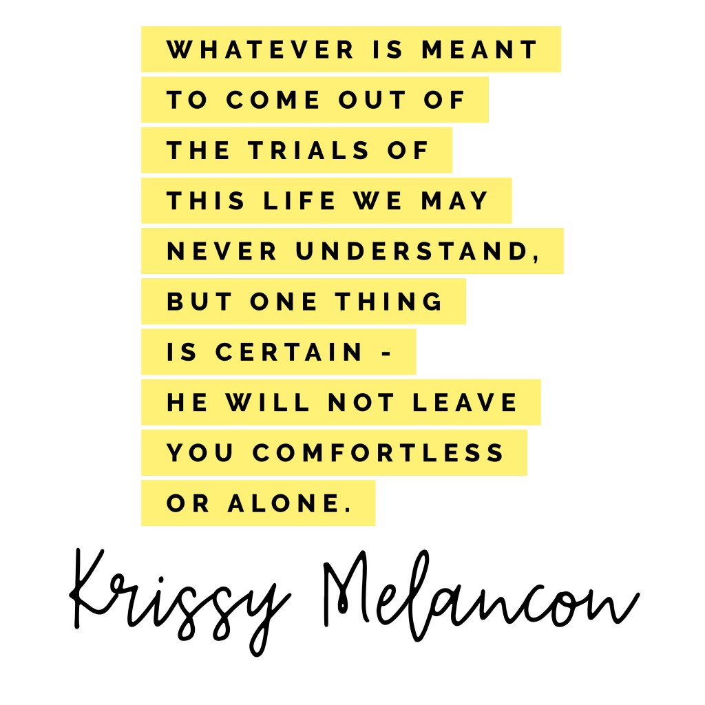 Most importantly, I feel Him around me, His love, His comfort and His strength. Whatever is meant to come out of the trials of this life we may never understand, but one thing is certain – He will not leave you comfortless or alone.