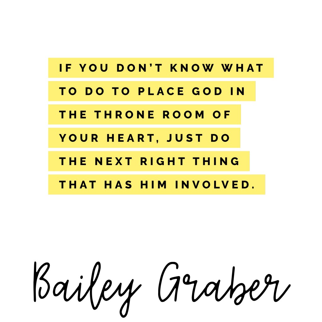 Creating a habit of putting God first won’t happen overnight, so be patient with it. If you don’t know what to do to place God in the throne room of your heart, just do the next right thing that has Him involved.