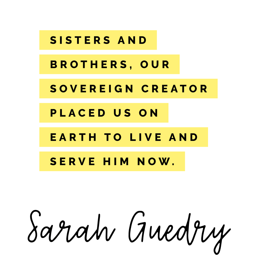 Sisters and Brothers, our sovereign creator placed us on earth to live and serve him NOW. He makes no mistakes. He is never surprised. He is working around us to seek and save the lost and inviting us to play a part in history by bringing Him glory. He spoke over you before you were created and he has placed you here – for such a time as this.