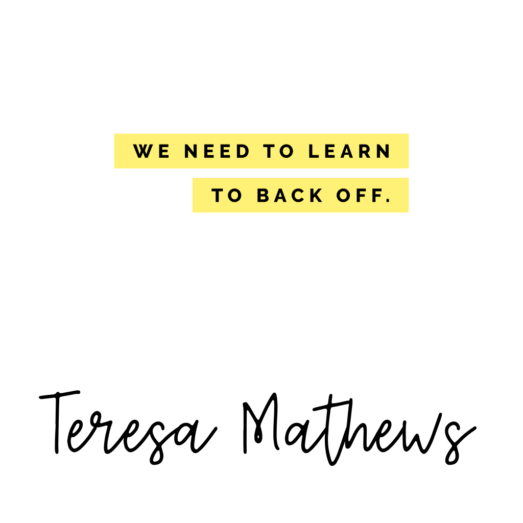 This season of change in our lives as parents is not easy. If we cling too hard to them and interfere every time and try to fix it God can’t teach them what He needs for them to learn. All through my life with my girls I was the fixer. You’re mad so I am too, I need to jump in and take over, you got it. But by doing this my girls have missed out on what God was teaching them. We need to learn to back off. God has this under control and we need to trust Him. Being on the sideline is hard as a parent. God has told me many times “ back off I got this.” This is not easy as a parent I know but we have to learn to let God guide them and us.